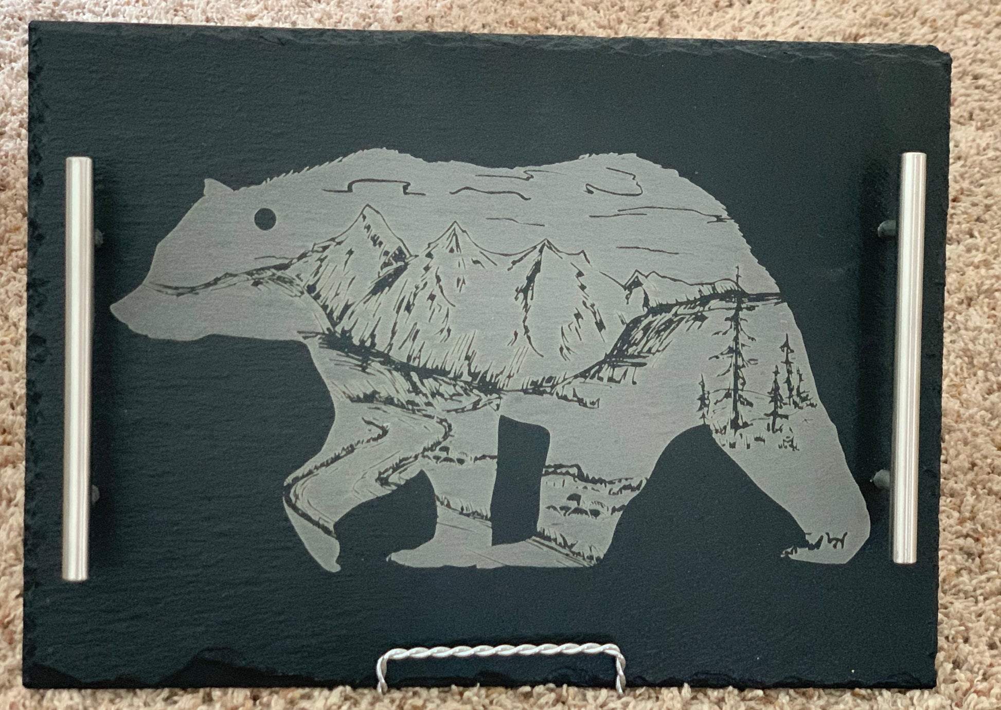 Silhouette of a bear with a mountain scene inside the bear. With silver metal handles and a protective food safe finish. L 13.75 X W 9.75.